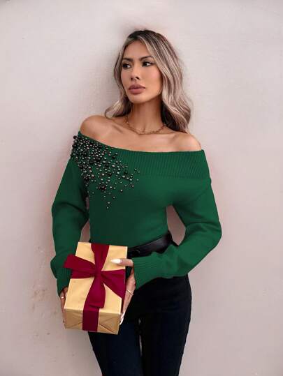 Aphrodite™ modischer Pullover mit Off-Shoulder-Schnitt und Perlen.